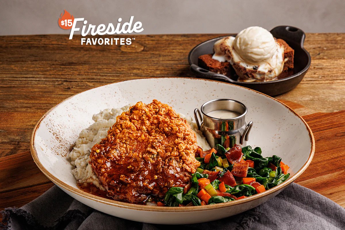 One buttermilk-fried chicken breast, served with red skin potato mash, white gravy, hot honey and sautéed spinach with smoked bacon. Served with a personal S'more Brownie Sundae or Banana Pudding.
