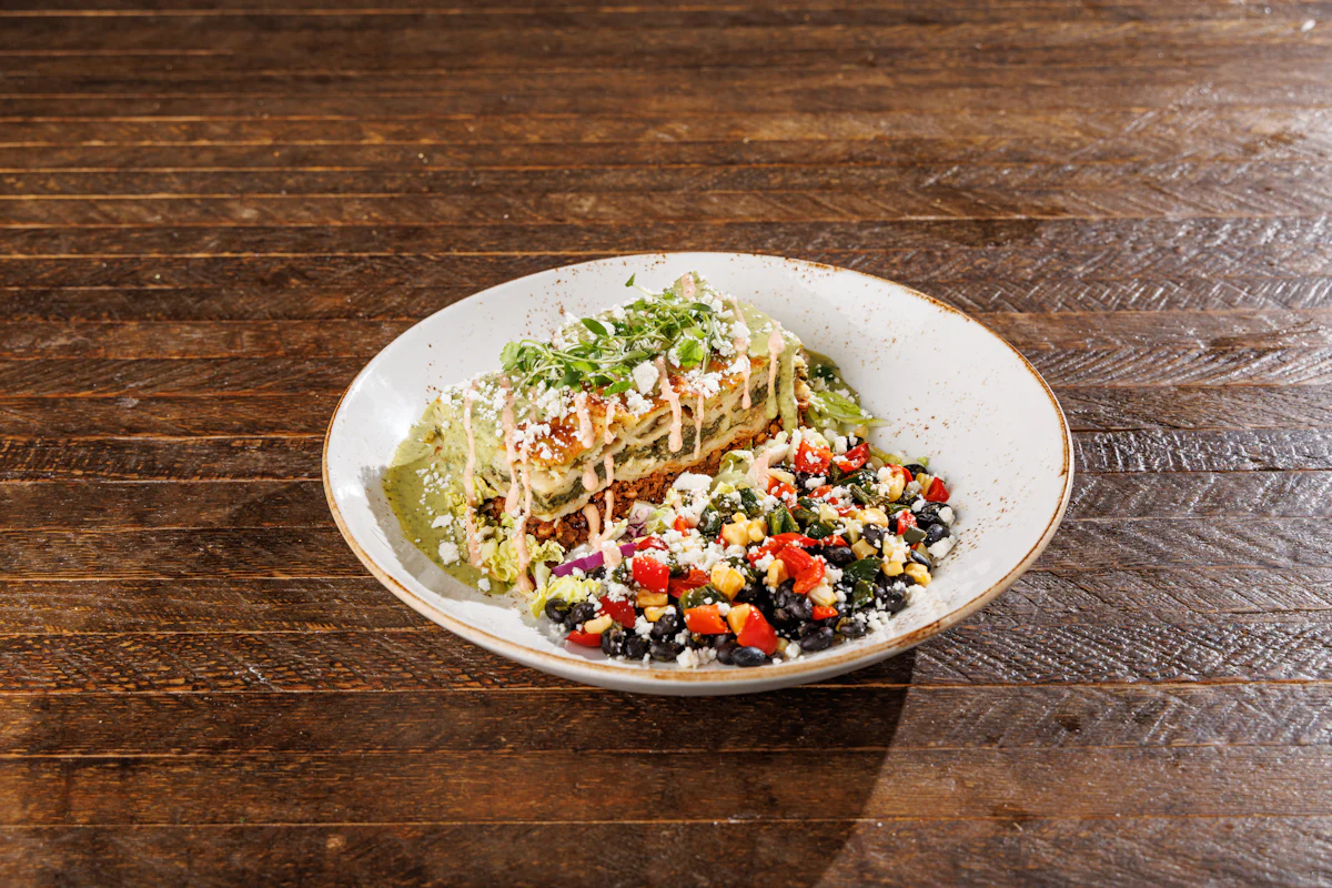 layers of housemade vegetarian mushroom, brown rice + walnut chorizo, baby spinach, corn tortillas + queso blanco served with cilantro black beans, roasted corn + bell peppers, creamy poblano sauce and spicy crema [1080 cal]