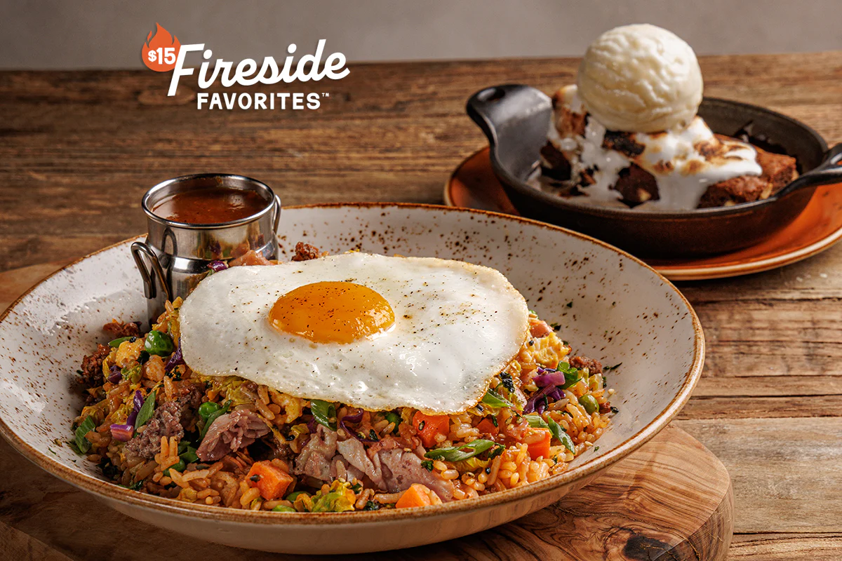 Wok-fired rice with shaved hickory-smoked ham, seasoned ground beef, ginger, garlic, cabbage, peas, carrots, soy sauce + garlic chili crisp, topped with furikake, green onions and a sunny-side up egg, with a side of housemade teriyaki gravy. Served with a personal S'more Brownie Sundae or Banana Pudding.