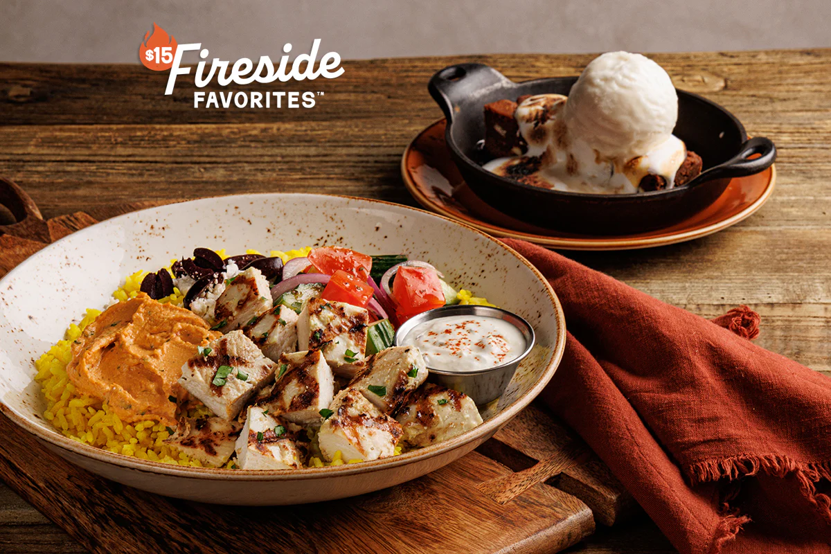 Grilled lemon chicken breast, yellow rice, tomato-cucumber-feta salad, kalamata olives, tzatziki sauce, red pepper hummus. Served with a personal S'more Brownie Sundae or Banana Pudding.