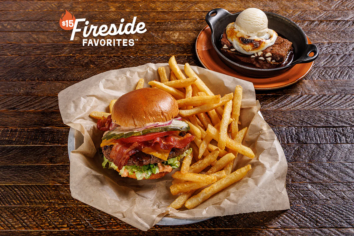 Grilled half-pound beef patty, smoked bacon, cheddar, chipotle ranch, lettuce, tomato, pickle, red onion. Served with a personal S'more Brownie Sundae or Banana Pudding.
