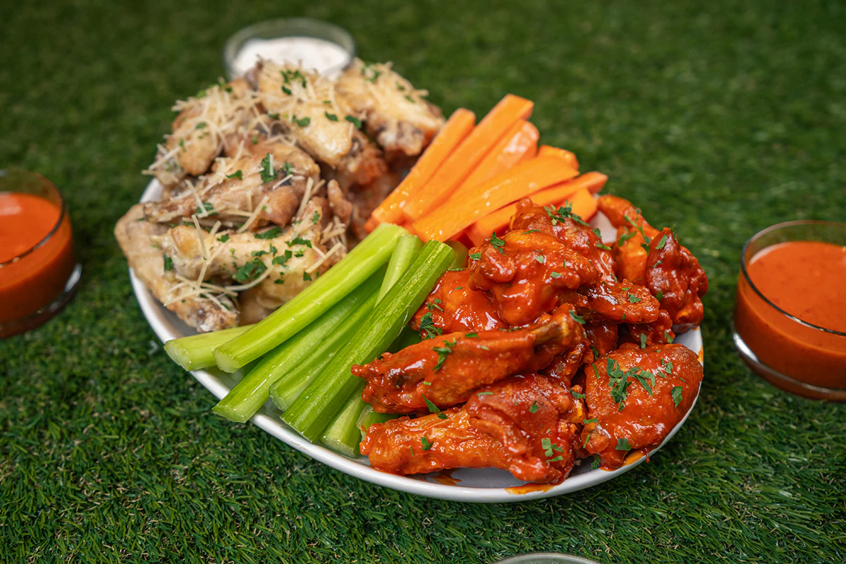 Bone-In. Choice of two housemade sauces + two dips. Includes veggies. (Serves 8, 32 wings)